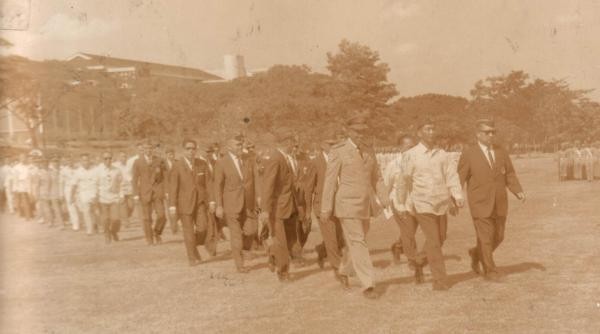 Vanguard Ferdinand Marcos '37 leading the UP Vanguard Homecoming Parade at the UP Sunken Garden
